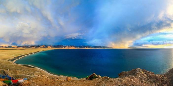 乌云被强劲的风吹开,夕阳照在湖面和对岸的山上,扩散的雨云掠过念青唐古拉山,