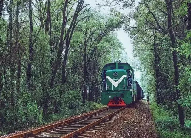 在笔直的铁路上空编织成仿佛能穿越时空的隧道