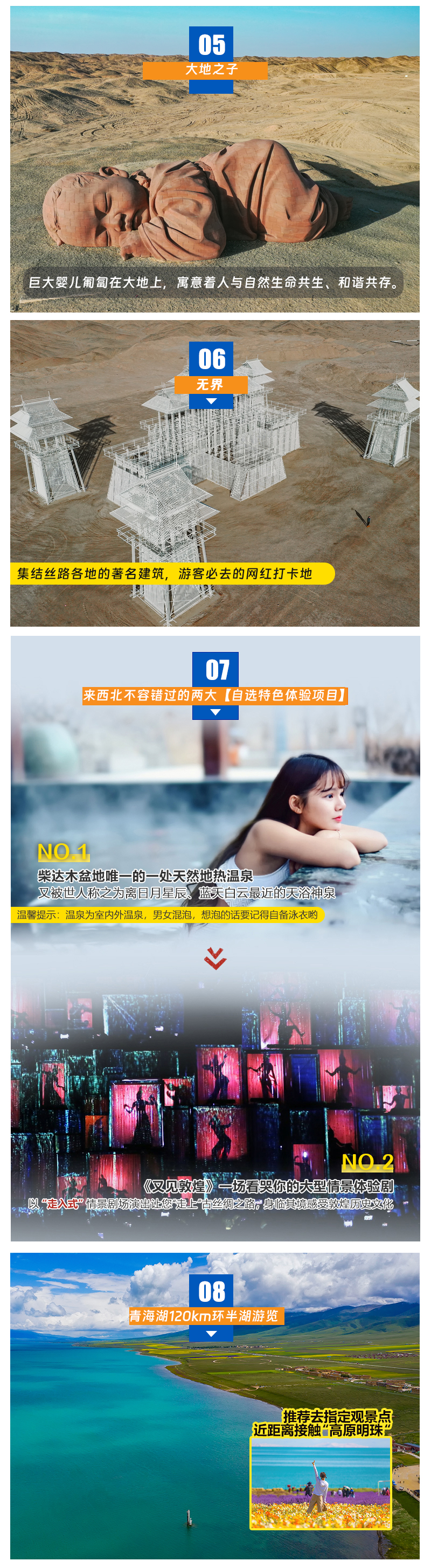 【门票】青海湖二郎剑门票(参考价:90元/人)、茶卡盐湖景交和小火车(可选)、大柴旦翡翠湖门票50+景交车60、嘉峪关门票110、鸣沙山娱乐项目游玩费用、大柴旦雪山温泉(由于个人身体特殊情况和喜好问题故不含费用)、敦煌丝路遗产城门票(参考价:60元/人)、塔尔寺门票70+景交车35(塔尔寺因个人宗教信仰爱好不同,故通常安排为门票自理);
