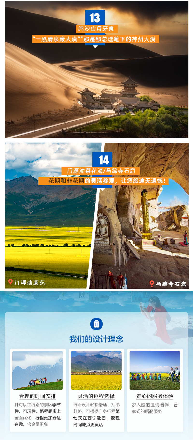 门源油菜花每年一般在7月中旬-8月初,花期较短,且因地理位置限制,如遇非花期季节,我们将安排前往马蹄寺参观游览。