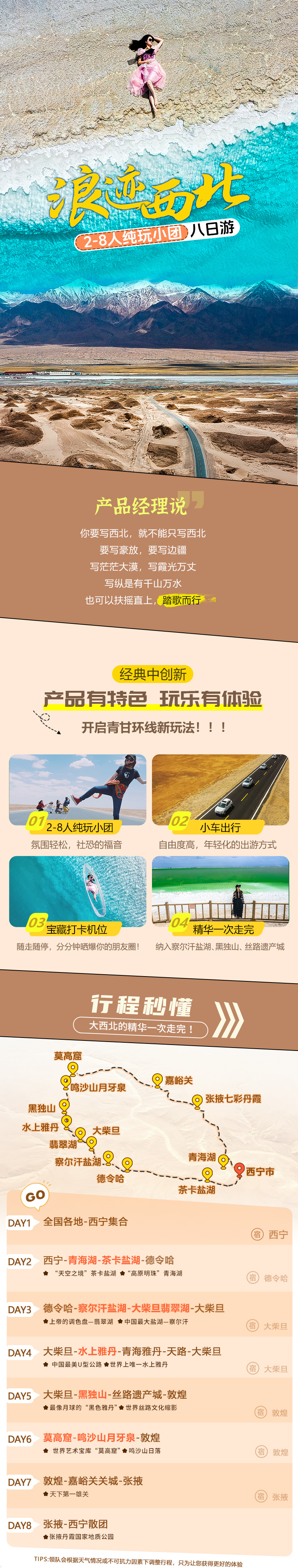 4.【东台吉乃尔湖】会随着水量变化时有时无,如果行程期间东台吉乃尔湖开通,我们会带领大家顺路参观,若产生门票、停车费等,费用自理