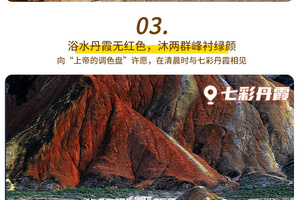 1.张掖七彩丹霞的游览顺序比较复杂,我们会在进入景区之前给大家发游玩攻略,在景区也内会有标示。在丹霞地貌大家先去二号点观景台,一号和五号观景点会有一些别致的形状,可以近距离观看其细节。最后去最佳拍摄点的四号观景台,观景台背后有一座吊桥,过桥之后还有一个云端观景台,云端观景台是面南背北的,可以看到整个七彩丹霞的全景,从高处俯视如同航拍一样,气势无与伦比。还可以走到北面,拍摄临泽县的白杨林和村落。景区新开放的五号观景点,相对更加壮阔,今天我们的住宿靠近七彩丹霞景区,步行即可到达;