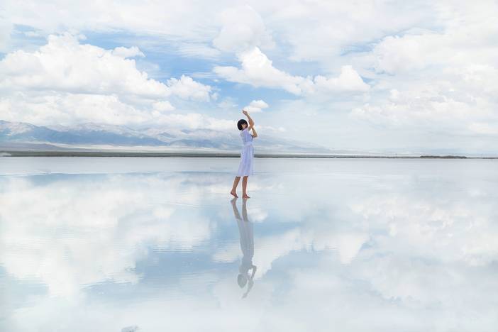 5.在茶卡盐湖玩一定得下水才好玩,必须准备一双拖鞋和色彩艳丽的衣服。盐湖玩的时候注意不要踩进盐井里。