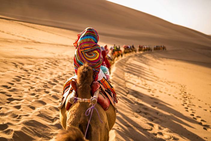 尽情游览之后,我们推荐品尝有着“中华一绝”美誉的敦煌特色小吃:驴肉黄面。当鲜美滑嫩的驴肉卤汁遇见多筋弹性十足的黄面,补血益气,满口溢香。餐后,驱车前往不一样的西北盛景【鸣沙山月牙泉】。鸣沙山和月牙泉是大漠戈壁中的一对孪生姐妹,“山以灵而故鸣,水以神而益秀”。无论从山顶鸟瞰,还是泉边畅游,都会心驰神往。沙漠中您可以自由选择骑骆驼、沙漠越野、或者直接步行上沙山。抢占一个绝佳的位置,静候夕阳西下。落日斜晖为细沙镀上了一层薄薄的金色,随手拍下一张剪影,温柔了整个大漠。