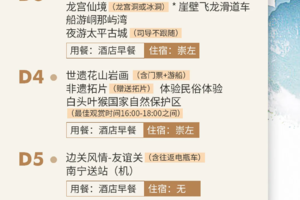 餐食:全程含酒店提供的早餐(一间房包含2人早餐,如多有儿童需自理)4早。崇左美食多为东南亚风味、少数民族美食、融合菜,风味独特,为了让您拥有更好的用餐体验,请您自理正餐,自己点餐,丰俭由人。