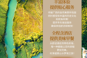 导游:广西专职中文导游提供贴心服务;人数4人起(含4人)安排导游,4人以下不安排导游,安排司机兼管家服务。