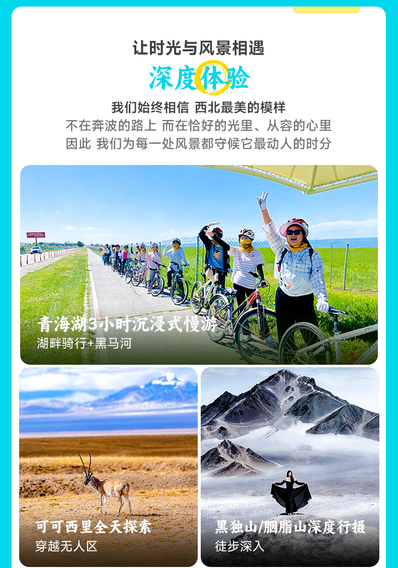 青海湖环湖公路被誉为中国最美公路之一。我们特别安排【青海湖骑行体验】(免费赠送,约1小时),在湖畔专属绿道安全骑行,迎着湖风,穿梭于湖水、草场、花田与山丘之间,以独特视角感受青海湖的每一寸动人风光。