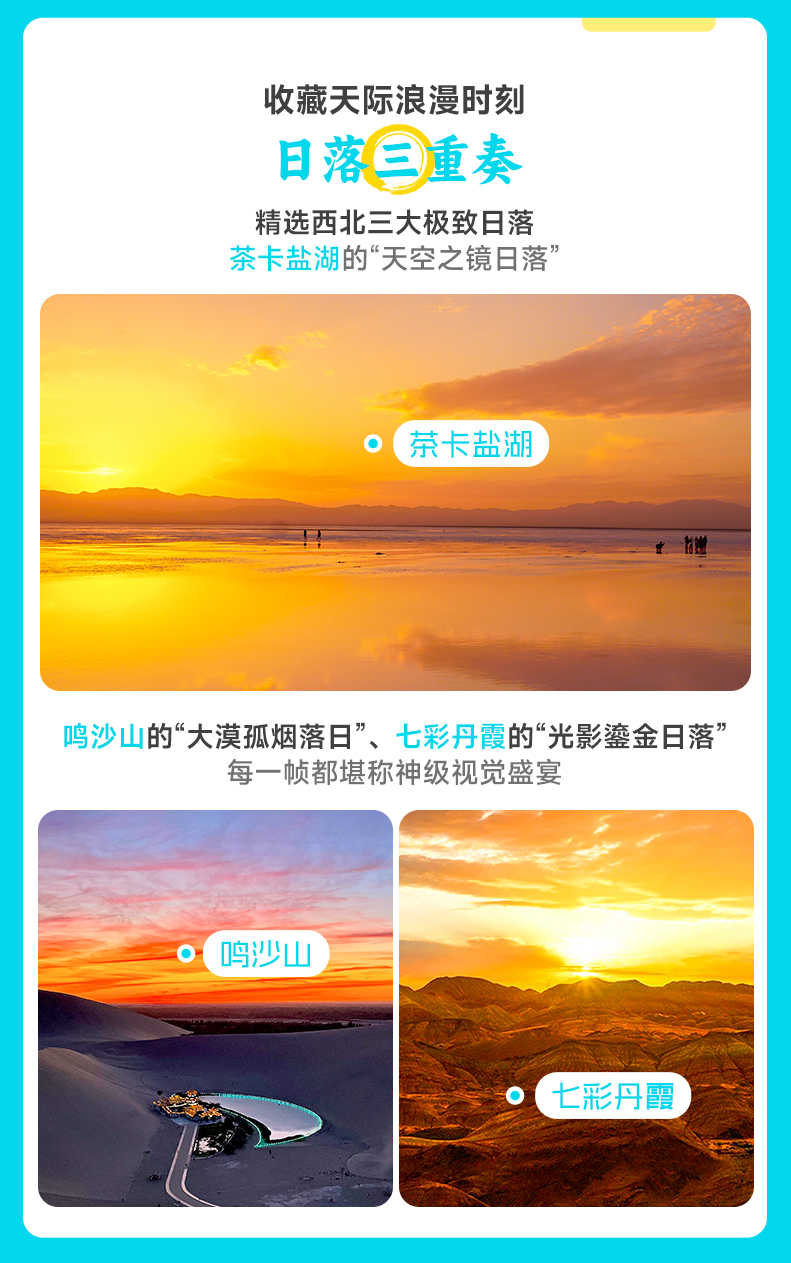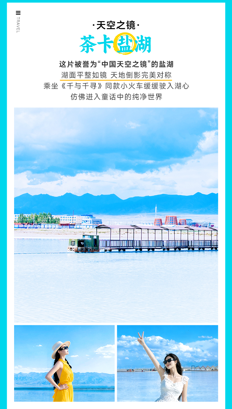 1、茶卡盐湖分为老景区【天空之境】和新景区【天空壹号】两大景区,天空之境以自然景观和盐雕为主,游客较多;天空壹号新增了游乐项目和表演,打卡拍照点更多,行程默认前往【天空壹号】景区(互动体验丰富,游客相对较少);
