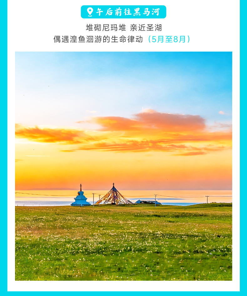 随后,前往【黑马河】(约50公里,1小时车程,游玩约0.5-1小时)。与常规的环湖景点相比,这里游人更少,却保留了青海湖最原始纯粹的风貌。湖水在高原阳光下折射出不同层次的蓝,草原辽阔起伏,牛羊如星辰散落。你可以在湖边漫步、戏水、堆砌玛尼石,感受高原湖畔的宁静与生动。