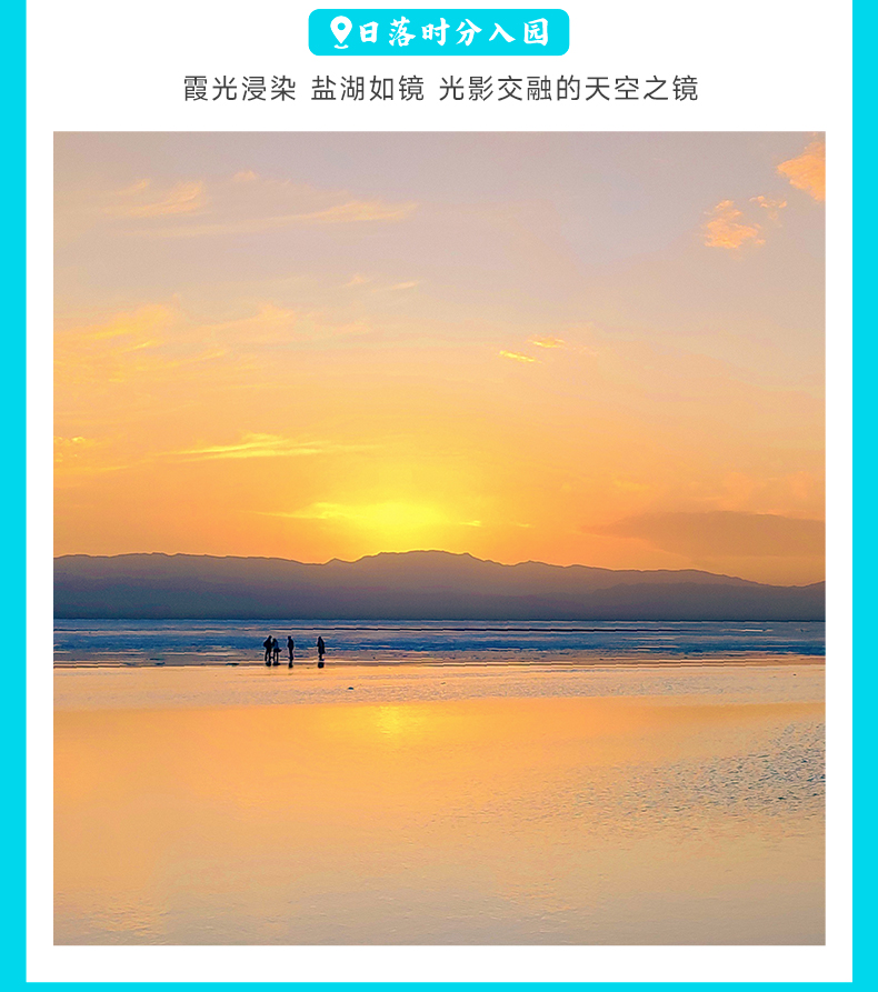 下午适时前往“天空之镜”【茶卡盐湖天空壹号景区】(车程约2.5小时),在此等待一场梦幻盐湖日落(游玩约3-4小时)。这里被《国家旅游地理》杂志评为“一生必去之地”,湖水与天空在盐层之上交织成一片无垠的幻境,远山静卧,云影流转,行走其间,宛若漫步云端,分不清现实与倒影的边界。还可以乘坐《千与千寻》同款小火车(费用自理,自愿选择),缓缓穿行于盐湖深处,窗外是延展的白色盐田与倒映的蓝天,仿佛驶入童话中的平行世界。当日落时分,整片盐湖渐次染上金黄与绯红,天地璀璨如画,随手一拍皆是壁纸级大片。