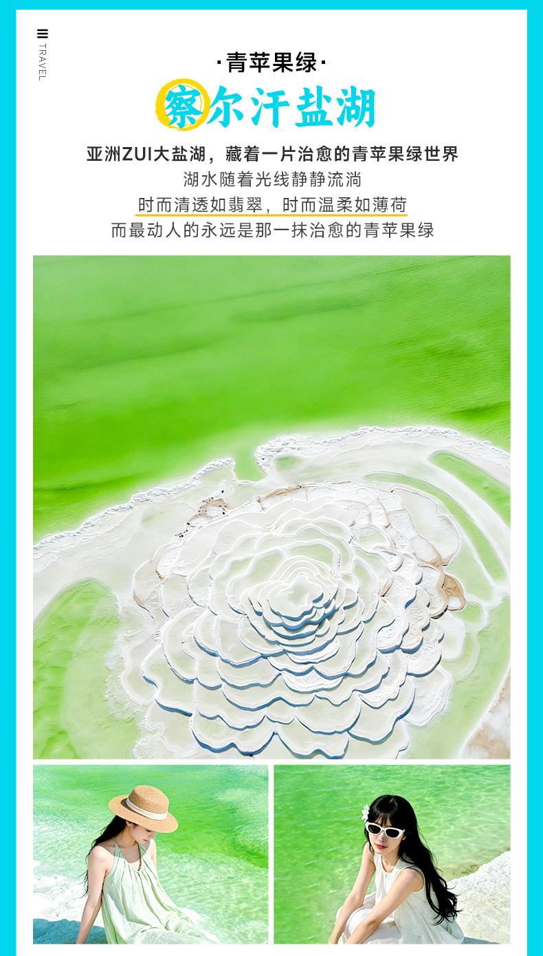 中午,乘车前往【察尔汗盐湖】(约257公里,3小时车程,游玩约2-3小时),这里不仅是亚洲zui大的盐湖,更是一处会呼吸的色彩艺术馆,这里的湖水就像被施了魔法,有时候是清透的苹果绿,有时候是温柔的薄荷青,在纯白盐晶的映衬下,宛如大自然打翻的调色盘。阳光洒落时,湖面泛起粼粼波光,那一抹青绿仿佛有了生命,随光影流转而变幻深浅。