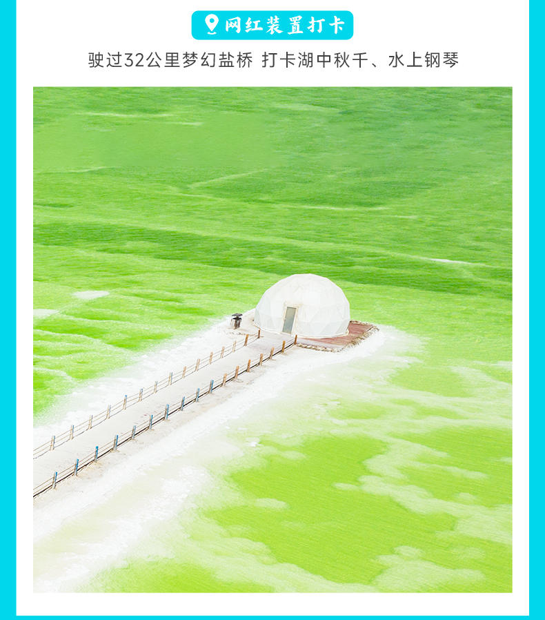 行程中,我们将驶过独特的“万丈盐桥”,一条由盐筑成的神奇之路。放眼望去,无垠的盐田在阳光下闪烁着晶莹光芒,纯白盐海延伸至天际,倒映着蓝天白云,营造出似梦似幻的“天空之境”奇观,让人仿佛置身于纯净的异度空间。走进湖心,你会看见神奇的自然盐花,形状像珊瑚又像小蘑菇,晶莹剔透特别可爱。解锁网红打卡点:湖中间的秋千、水上的白色钢琴、还有形状特别的礁石群,随便一站都能拍出氛围感拉满的照片。