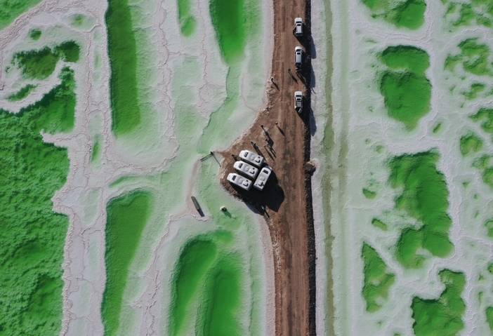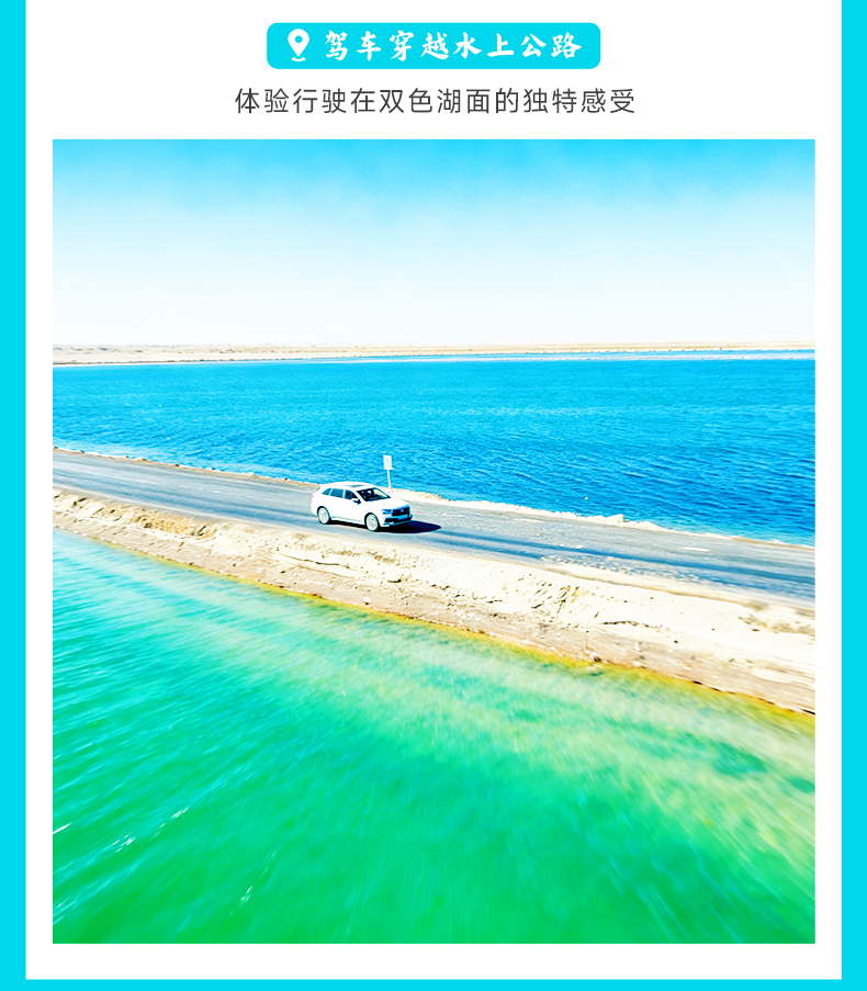 下午,前往【西台吉乃尔湖】(约35公里,30分钟车程,停留约20-30分钟),G315国道将湖面一分为二,形成“一半湛蓝,一半翠绿”的双色奇观,被游客亲切称为“鸳鸯火锅”。蓝色一侧因含盐量高清澈如镜,绿色一侧因含铜离子浓郁如翡翠,湖水与天空交相辉映,构成一幅浑然天成的绚丽画卷。可以在安全区域航拍全景,拍摄水天相接的公路大片,季节合适时还能观赏斑头雁等水鸟,了解盐湖独特的地质成因。