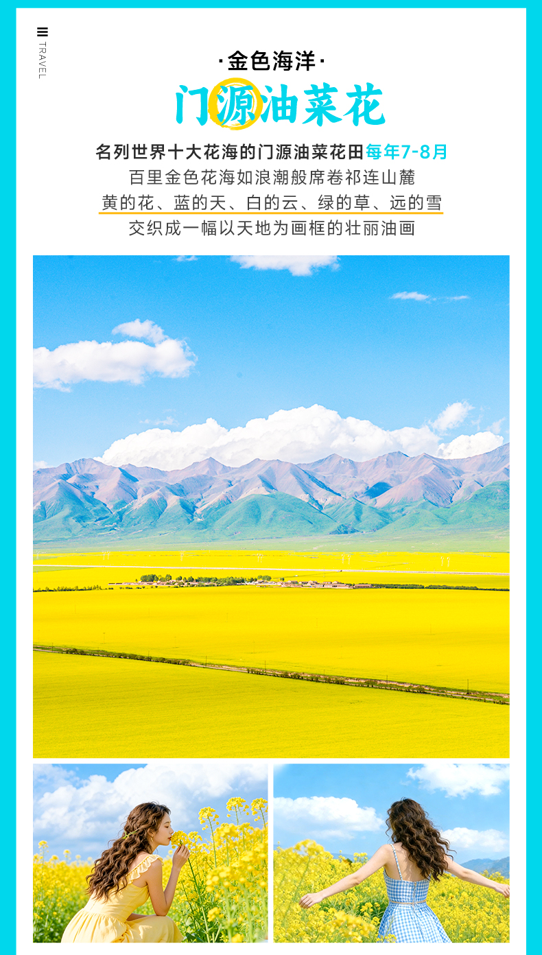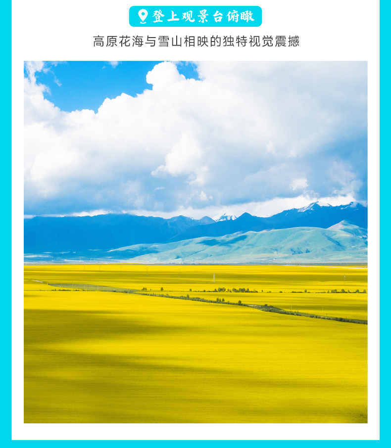 随后继续前往【门源百里油菜花海】(约80公里,1小时车程,游玩约1小时),这里是世界zui大的小油菜种植区,每逢七月花期,50万亩金色花海与远方的岗什卡雪山交相辉映,构成举世罕见的壮美画卷。我们将根据花期情况灵活选择最佳观景位置停车,让你沉浸于这片金色海洋(注:非花期期间将调整为雪山草原观光)。