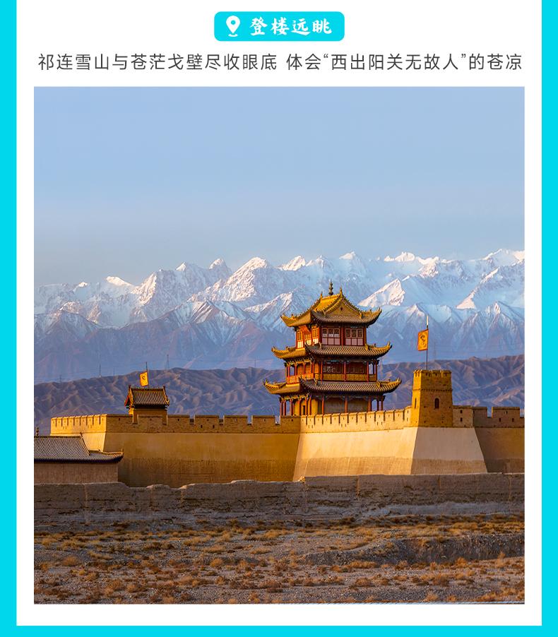 早餐后,前往被誉为"天下di一雄关"的【嘉峪关关城】(约370公里,4小时车程,游玩约1.5-2小时),这座明代长城西端的军事要塞,巍然屹立于祁连山与黑山之间的戈壁咽喉,斑驳的城墙见证着六百年的铁血烽烟。站在城楼俯瞰丝路古道,触摸历史余温,在箭楼瓮城间感受"西陲锁钥"的雄浑气魄。