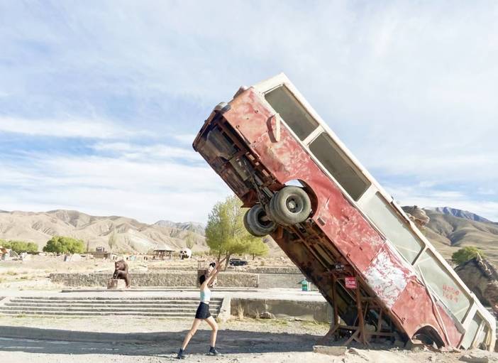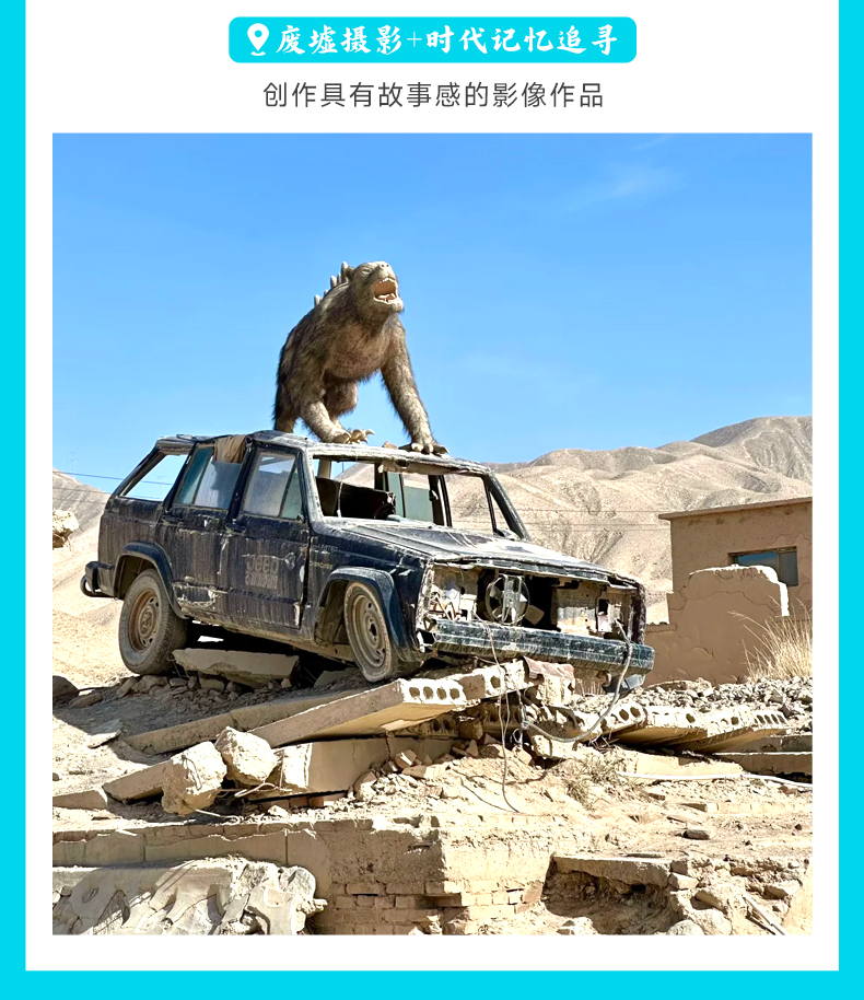 下午,前往到电影《九层妖塔》拍摄地【石油小镇】(约150km,2小时车程,游玩约1小时),这座位于阿克塞的废弃老县城,曾因石油繁荣,又因资源枯竭而人去楼空。漫步在保存完好的苏维埃式老建筑间,斑驳的墙壁、倾倒的公交车和电影中的怪兽道具,都将带你穿越回那个激情燃烧的岁月。特别推荐在工矿俱乐部、老县委大院等标志性场景打卡,感受时光凝固的独特氛围。