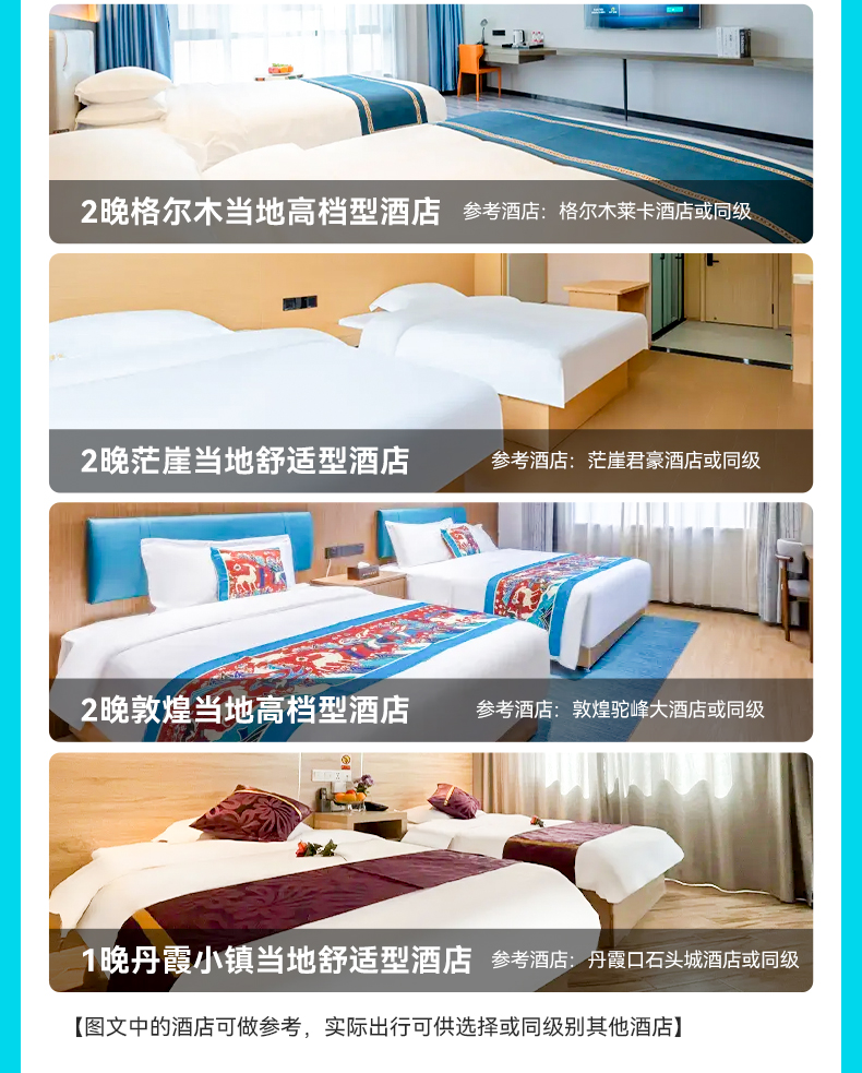 3、 行程中的所列的酒店类型,2星/2钻=经济型;3星/3钻=舒适型;4星/4钻=高档型;5星/5钻=豪华型;意为评定或条件到达相应标准的酒店,少部分地区,由于政策等因素,可能存在酒店条件满足,但未进行星钻评定的情况;