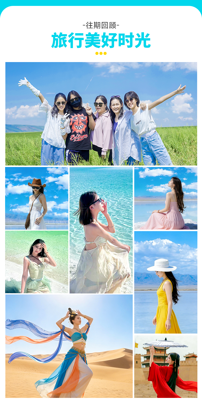 茶卡盐湖首道大门票30元/人、水上雅丹门票+景交车60元/人、莫高窟门票+景交车148元/人、鸣沙山月牙泉首道大门票60元/人、嘉峪关关城首道大门票60元/人,石油小镇首道大门票15元/人,张掖七彩丹霞首道大门票37元/人