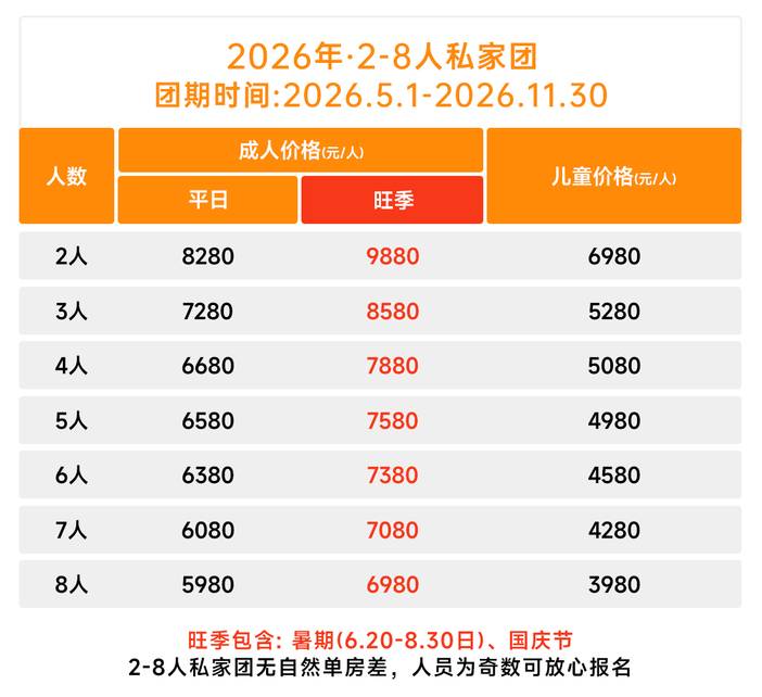 【成团说明】2-8人私家团: 一单一团随时出发(私家团均为司兼导)
