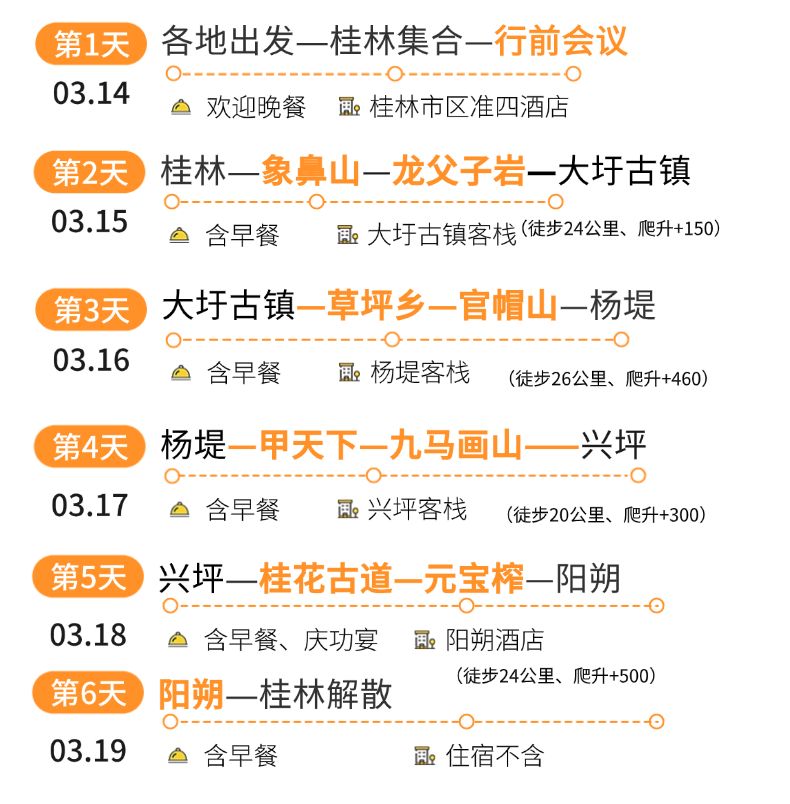 今天是集合日,全国各地队员自行前往桂林集合报到。抵达指定酒店后报徒个中国+姓名即可办理入住。晚上18点,欢迎晚宴,发放赠送的鞋垫和衣服,介绍领队、活动行程及注意事项。