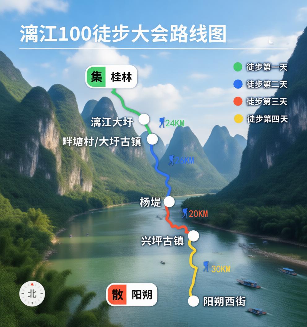漓江100公里徒步,是一条从桂林象鼻山出发、沿江走到阳朔西街的经典路线。人们常说“百里漓江,百里画廊”,走在这条路上,你会真切感受到这句话的分量:两岸喀斯特峰林连绵起伏,江水清澈蜿蜒,途中经过大圩、杨堤、兴坪等古镇古村,每到一处都能歇脚、补给。