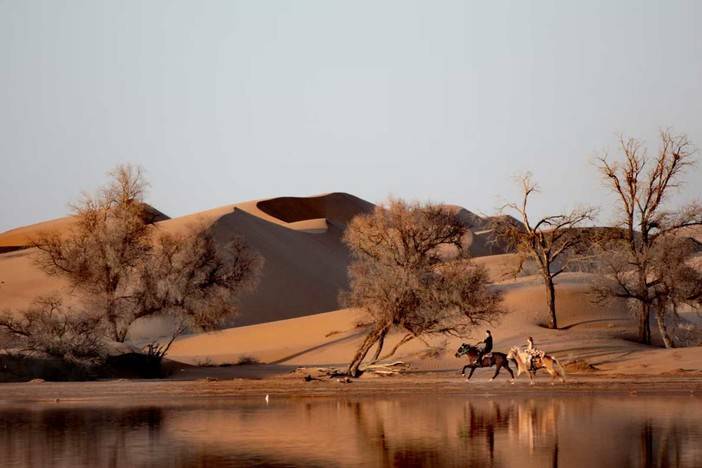 今日我们可以在小天鹅湖营地拍摄我们在沙漠腹地的第一次日落。工作人员团队准备好了大锅炖羊肉桌餐和米饭,此时此刻会体会到沙漠晚餐的美味。