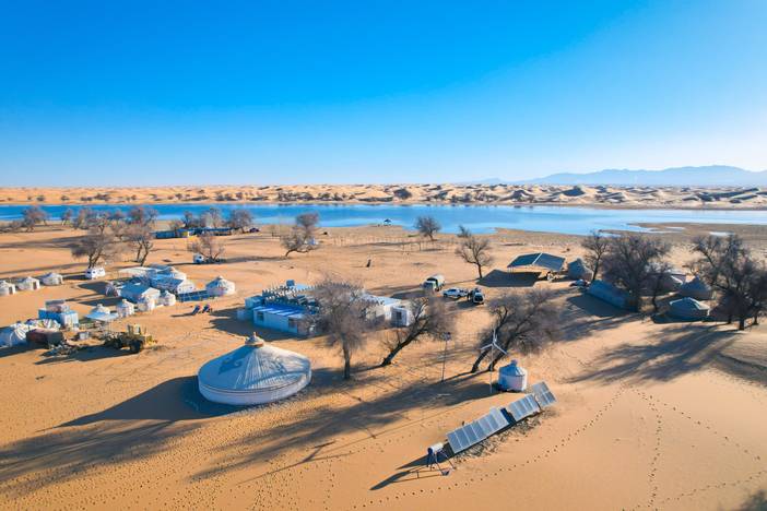 傍晚抵达 小天鹅湖营地,结束第一天的沙漠行走。今晚夜宿湖畔营地,在宁静的沙海与星空之下度过腾格里的第一夜。