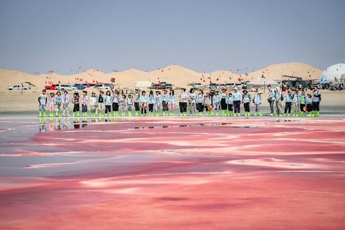 今日途径火爆网红打卡点【地球心脏-乌兰湖】,在腾格里沙漠深处的无人之境,有一颗鲜红的,正在跳动的“地球之心”,这里没有人烟,也没有信号,这是一片炙热的红色湖泊,在地球上沸腾,就像是地球跳动的脉搏。走在湖边,就像行走在一盘巨大的粉色调色板上,如果不亲眼所见,你绝对不会相信这些现切的雪花牛肉和灌满石榴汁的湖泊是真实存在的。