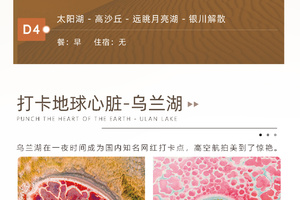 今日沿途可远眺月亮湖(不进入湖内),碧绿湖水、漫漫黄沙、蔚蓝天空在这里交织成一个美妙的画卷,继续行走10公里到达终点! 领队在终点为大家颁发奖牌,集沙瓶,合影留念;午餐过后,大家一起返回银川解散。